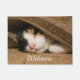 Welcome doormat featuring Macy, a young, full blooded Calico cat has climbed under a rug thinking she is hiding, to play. Did you know that only the female Calico's have all 3 colours (brown, black and White)? Male Calico's only have black and white. Looking for more prints or products? Feel free to visit my store: http://www.zazzle.com/timelessmomentsphtgy