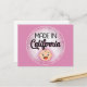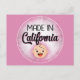 This funny postcard features a cute white baby face that says "Made In California" on a Pink background. Perfect for new baby announcements or just for fun.
