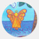 The California Beach Angel Painting shows an yellow-orange angel hovering over the ocean with the words "joy" on a cloud that has the sun peeking through. The words "peace" appear below on the sand next. A cheerful palm tree grows on the beach. See more about this painting at www.donnabellasangels.org/art/angel/california-beach-angel.html