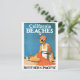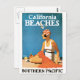 This vintage travel advertising poster is of a California Beach. A woman in a vintage swimsuit sits on the beach with the ocean behind her and a seagull flying overhead.