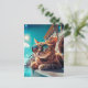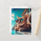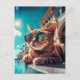 This postcard features a funny California cat wearing sunglasses, chilling out under the sun around a pool.