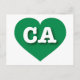 This postcard features a vibrant green heart containing the bold, white, upper case letters CA, the official abbreviation for California, the golden state. The reverse side of the postcard is blank, awaiting your handwritten sentiments or customized text.
