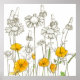 A fun poster decorated with a sepia ink drawing of California poppies, gaillardia and other wildflowers from the summer garden with watercolor accents.