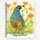 Un carnet décoré d'un Quail de Californie aux plumes colorées, posé sur une parcelle de fleurs de pavot orange vif inspirée de l'oiseau d'Etat et de la fleur de Californie dessinée à l'encre et peinte à l'aquarelle. Une jolie aquarelle orange orne le revêtement du dos.