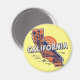 Fun refrigerator magnet features retro style California state silhouette on sunny yellow background
