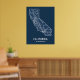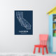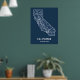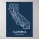 Graphic and simple poster with California State map with its main roads on an navy blue background.
