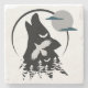 A black and white silhouette of a wolf howling at the moon. The wolf's head is tilted back, its mouth open in a howl. The moon is a large, grey circle with two small, dark clouds above it. The wolf is surrounded by a forest of trees, which are also silhouetted in black. The image's design creates a sense of mystery and intrigue. The wolf's howl is a primal sound, and the forest is a place of darkness and shadows. The moon is a symbol of hope and light. The overall effect is one of beauty and power.