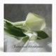 This design features a lovely photograph of white calla lilies and a green leaf resting on soft white lace. Text on reverse is easy to customize for your wedding or other event.