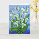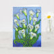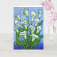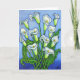 A stylized colourful painting of beautiful white Calla lilies done in a beautiful blue, green and white colour palette on a Greeting Card by Lisa Lorenz