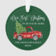 Script de calligraphie moderne Notre premier Noël dans notre nouvel ornement comprend Watercolor Vintage Camion rouge avec arbre de Noël. Arrière - plan vert forestier.