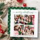 Modern Trendy Calligraphy Script 4 Photo Family Photo Collage Merry Christmas Square Holiday Card - Green with Snowflakes Back