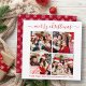 Modern Trendy Calligraphy Script 4 Photo Family Photo Collage Merry Christmas Square Holiday Card - Red with Snowflakes Back