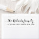 Simple rectangular design featuring family name and return address in modern calligraphy font. Easily personalize with your last name and address.