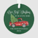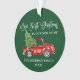 Modern Fun Calligraphy Script Our First Christmas in our New Home Ornament includes Watercolor Vintage Red Truck with Christmas Tree. Forest Green Background.