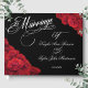 Calligraphy Photo Red Roses Black Wedding Guest Book. Celebrate your special day with this elegant marriage guest book, featuring a sophisticated black background adorned with vibrant red roses and flowing calligraphy script. This guest book is designed to capture the heartfelt messages and well wishes from your loved ones. The classic combination of deep black and rich red roses creates a timeless and romantic keepsake for your wedding. It's the perfect place to preserve precious memories and cherished autographs.