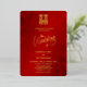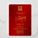 This modern Chinese wedding invitation features a real gold foil double happiness symbol with hearts and a calligraphic wedding headline on a shimmering red background.