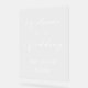 A minimalist white wedding welcome sign featuring elegant calligraphy script, printed on transparent acrylic. Customize the colours to match your theme.