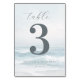 This wedding table card features a serene beach scene with gentle waves and a soft pastel sky, creating a tranquil seaside atmosphere. The design includes a large numeral "3" in muted grey-blue, complemented by elegant cursive typography for the word "table." Customizable placeholders allow for personalization with names and dates, while the minimalist layout emphasizes clarity and sophistication. The overall style is modern yet timeless, perfect for adding an element of calm elegance to your wedding celebration.
