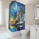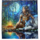A serene night unfolds by the river, illuminated by a glowing campfire. A Native Indian woman, adorned in traditional attire and jewellery, sits peacefully beside a majestic wolf