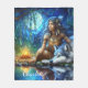 A serene night unfolds by the river, illuminated by a glowing campfire. A Native Indian woman, adorned in traditional attire and jewellery, sits peacefully beside a majestic wolf