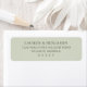 This return address label features a minimalist design with a solid, muted green background and centered text in an elegant serif font. The layout is simple and balanced, utilizing ample negative space to highlight the legibility of the black text. Perfect for those who appreciate modern, understated aesthetics, this label conveys a sense of calmness and professionalism. Its clean lines and classic style make it ideal for formal correspondence or special occasions where a touch of sophistication is desired.