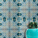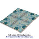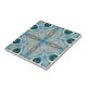 This ceramic tile showcases a complex kaleidoscopic pattern. The design is symmetrical, featuring abstract shapes that are reminiscent of flowers and geometric figures. The tile is adorned with a soothing palette of various shades of blue, teal, cream, and white, which blend harmoniously to create a visually pleasing effect. The central part of the design is characterized by overlapping layers that add depth to the overall pattern. Diamond-shaped elements are nestled in the middle, surrounded by petal-like structures. The use of darker tones at certain points provides a striking contrast, enhancing the visual appeal of the tile.