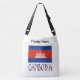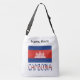 This crossbody bag has a large Cambodian flag with the word CAMBODIA, below, in the colours of the flag. Above is a place where you can add your name to personalize your bag, or create a custom gift. Great for travelers.
