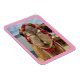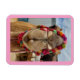 This magnet has a pink border and shows a closeup of a very cute camel. Wearing a colourful halter, this female camel with her big brown eyes, long eyelashes, and fuzzy-looking mouth and nose makes this magnet irresistible to every animal lover.