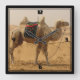 A furry two-humped camel wearing his fancy embroidered saddle standing patiently in the desert.