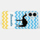 Who here loves camels? This phone case features the black silhouette of a dromedary (one hump) camel! The background is a blue, yellow, and white chevron pattern, meant to invoke the image of the desert, with yellow sand below and blue sky above. Below the camel is a space to add your own name or short message, so you can make this item uniquely yours!