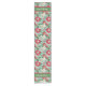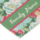 Customize this elegant table runner with a pattern of red and white camellias on a teal background with your family name.
