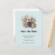 Save the date postcard with a vintage styled camera decorated with flowers. Pastel colors of pink, cream and green.