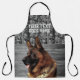 A German Shepherd themed apron. A one of a kind and an original design. The design features a muted camouflage pattern with a German Shepherd dog on a textured background. The text can be deleted or changed to suit your business or add your name. ====DESIGN TIP===