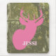 A mousepad featuring an illustration of a pink deer head over a camouflage background. Personalize with your name.