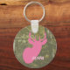 A keychain featuring an illustration of a pink deer head over a camouflage background. Personalize with your name.