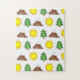 Puzzle design features an original marker illustration of a sunshine, tree, and snow-capped mountain peak.