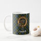 Campbell crest badge surrounded by a strap and buckle over tartan background. Custom text on both sides.