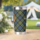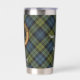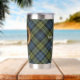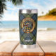 Campbell crest badge surrounded by a strap and buckle over tartan background. Custom text on both sides.