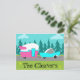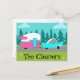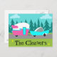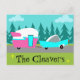 Ce Camper Retro Personnalisable / Remorque et Carte Postale de Voiture dispose d'un dessin humoristique moderne et minimaliste du milieu du siècle qui vous laissera prêt à prendre la route ouverte. Hommage aux années 1950, ce design présente une voiture turquoise vintage au sommet blanc, tirant une remorque kitschy vers sa destination finale. Le RV rétro parfaitement restauré a une moitié inférieure rose chaud, une moitié supérieure blanche et un boulon turquoise séparant les deux. La porte du côté du camping est également turquoise. L'accent final est l'aile rose chaud qui monte de l'arrière de cette maison sur roues. Les campeurs heureux roulent sur une route grise. La route est entourée d'herbe verte et luxuriante. Dans l'arrière - plan, on peut voir les silhouettes turquoises d'une véritable forêt de cèdres, contre un ciel d'aqua aux nuages bouffants et bleu clair. La partie inférieure de ce design peut être personnalisée! Ce design est parfait pour tous, des hippies à la retraite, des hipsters en herbe, ou tous ceux qui veulent revivre de grands souvenirs d'enfance. La meilleure partie est que personne ne demande : "Sommes-nous encore là ?"