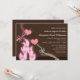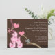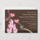 Pretty and cute campground wedding invitations with two hearts on branches being held over a pink hearts glowing campfire, over a brown background, and your wedding details custom printed in a white font.