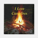 Photograph of a campfire made of sticks, surrounded by rocks, burning against dark night. Customizable text reads, "I Love Campfires."