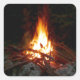 Photograph of a campfire made of sticks and surrounded by rocks, burning against a dark night sky.