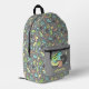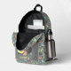 This backpack is perfect for your next hiking or camping trip. It features pretty pastel coloured illustrations of hiking and camping gear like hiking boots, fanny packs, enamel mugs and binoculars along with butterfly and floral accents. The illustrations in lime green, aqua blue, peachy coral, pale yellow and charcoal grey are set against a grey background. The front pocket is ready to be personalized with a name in pale yellow lettering.
