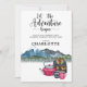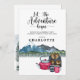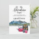 Let the adventure begin themed watercolor glamping camping birthday invitation with forest and mountains wilderness landscape and calligraphy script typography. For a weekend of fun!