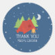 Camping fête d'anniversaire préférez les autocollants avec tente, arbres et arrière - plan de nuit étoilé.