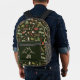 Camping and hiking khaki green backpack patterned with campground doodle elements in tones of green and brown. The front pocket area has a rustic mountain range design over the customisable monogram text