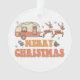 Camping Joyeux Noël Reindeer Typography Ornament présente le texte "Joyeux Noël" dans une typographie rétro avec une caravane décorée festive tirée par des rennes et accentuée de flocons de neige et de saints. Conçu par Evco Studio www.zazzle.com/store/evcostudio