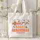 Camping Merry Christmas Reindeer Personalized Name Tote Bag features the text "Merry Christmas" in a retro script typography with a festive decorated caravan being pulled by reindeer and accented with snowflakes and holly. Personalize with your custom name for a super gift. Perfect gift for family and friends for Christmas and the holidays. Designed by Evco Studio www.zazzle.com/store/evcostudio