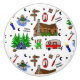 Graphics of log cabins, RVs, Camping tools, tent, fishing boat and other cute graphics.