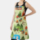 Camping scene - caravan, camping chairs, fire place, rugs, trees, birds. Seamless vintage pattern.